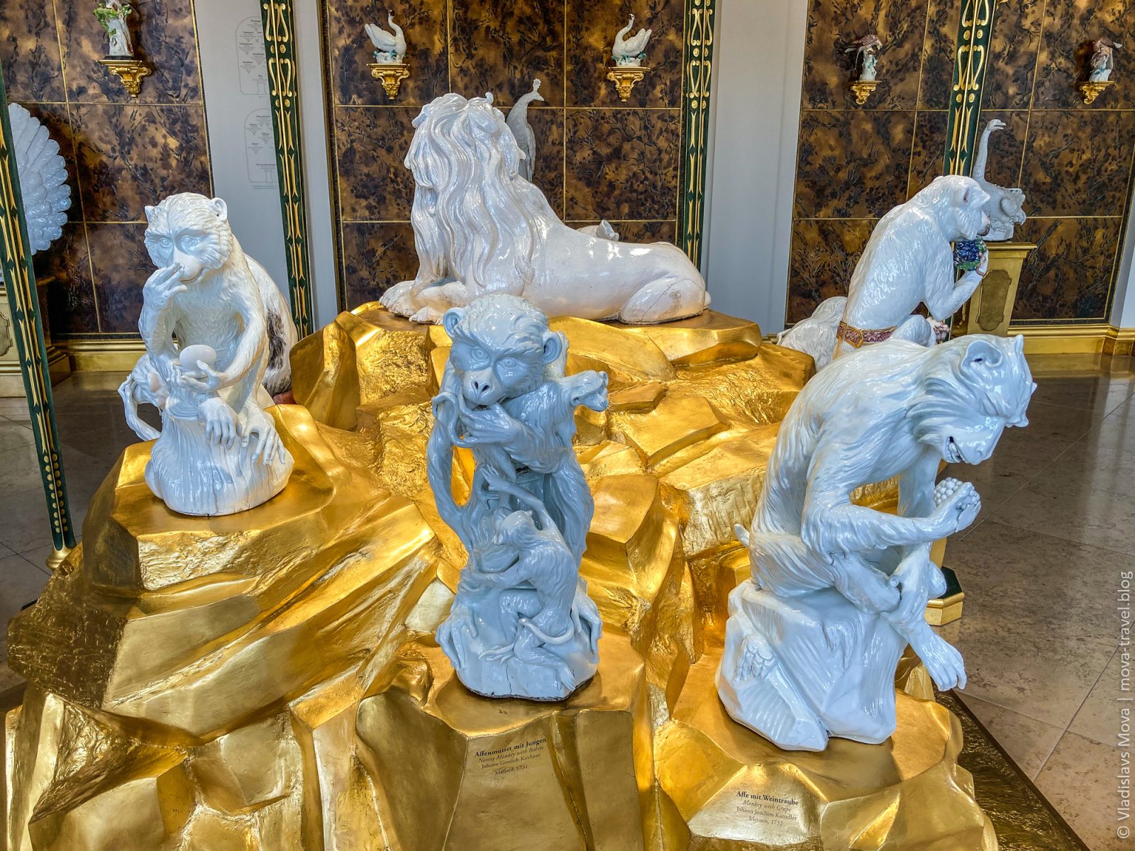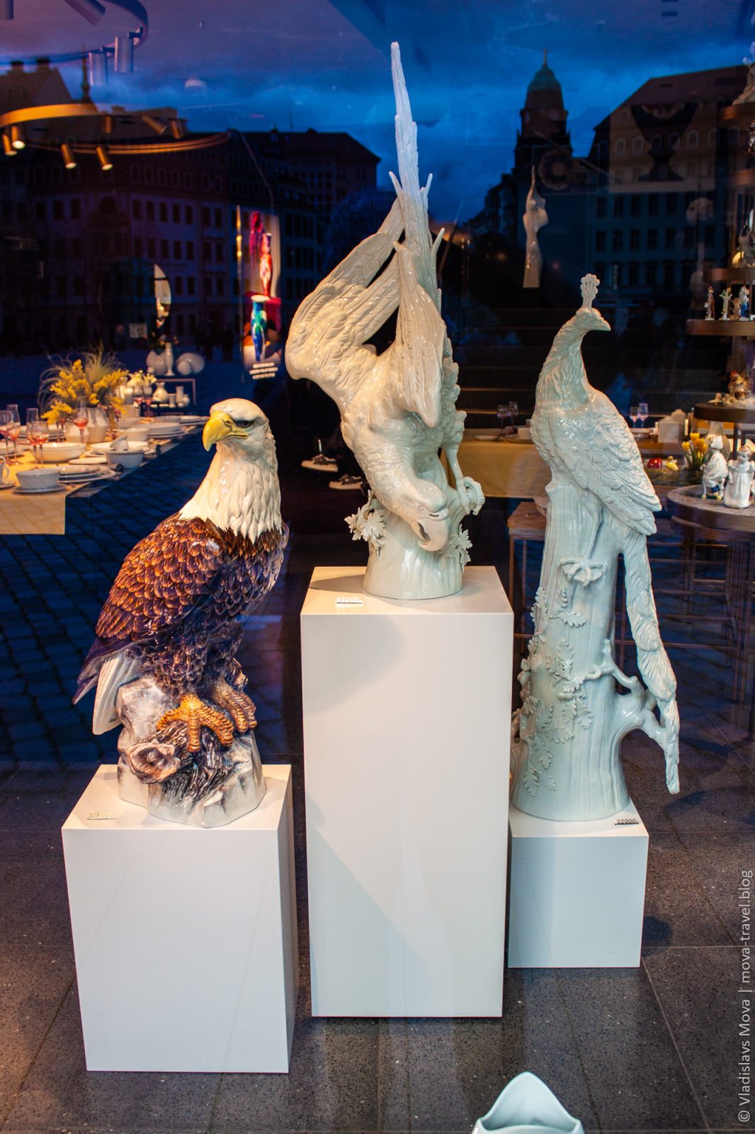 Кстати, подобные фигуры – обитатели не только музейных витрин. Прямо в центре города есть фирменный магазин мейсенского фарфора, в котором, к примеру, можно купить вот таких вот замечательных птиц. Разумеется, только если вы не нищий: самый простой орёл (в центре) обойдётся вам в 45 000 евро, павлин – в 52 000 евро, а роскошный цветной орёл стоит все 70 000 евро. Ну что, готовы продать свою квартиру ради настоящего произведения искусства?