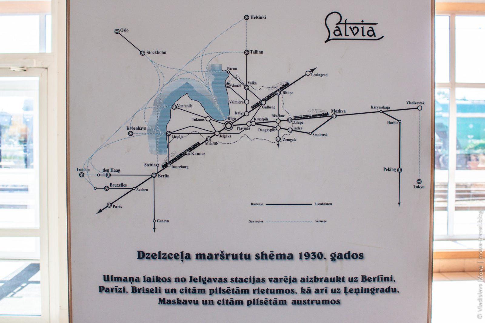 Зато внутри вокзала висит весьма и весьма любопытная схема железнодорожных маршрутов времён Первой республики. Сегодня подобный план ограничился бы лишь Литвой да Эстонией, что, несомненно, очень печально. Хотя, с другой стороны, и на том спасибо – буквально несколько лет назад на такой карте не было бы и Литвы: пассажирское железнодорожное сообщение между этими двумя соседними странами отсутствовало более десятка лет.