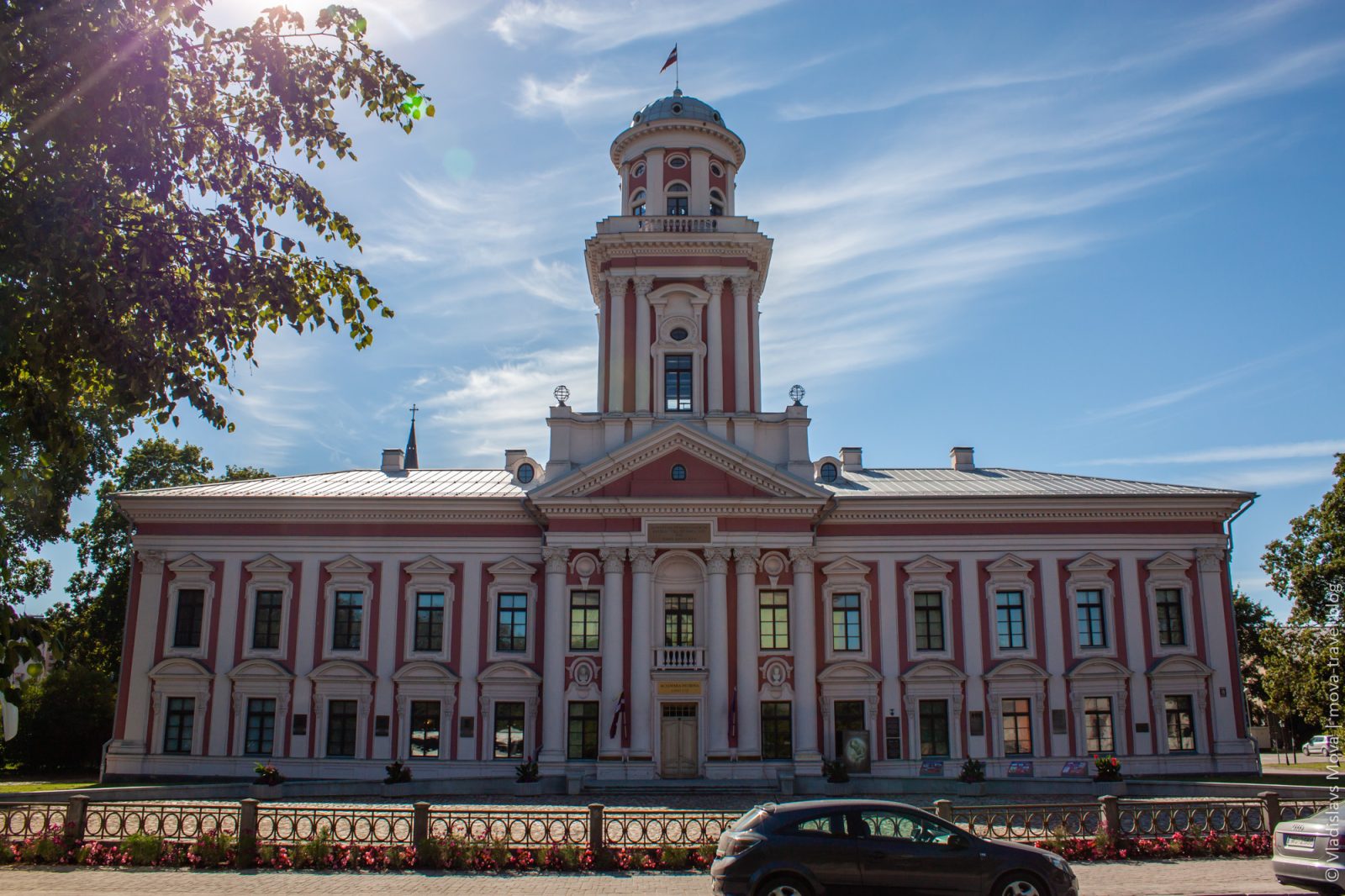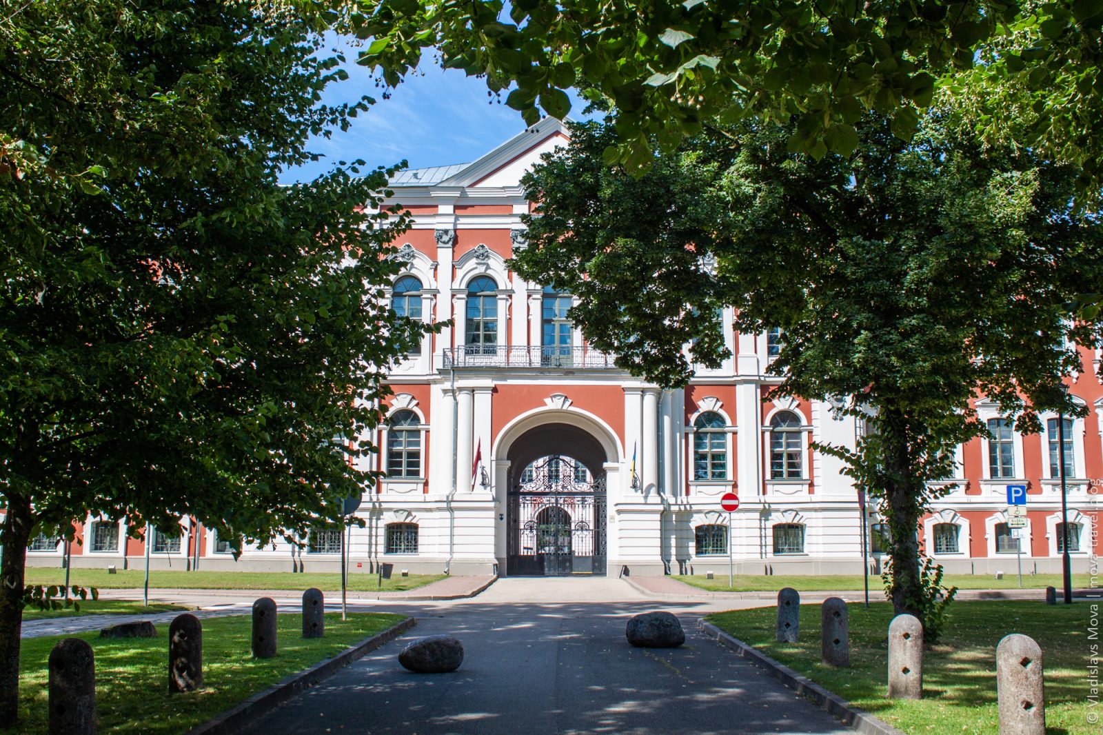 Ещё одно роскошнейшее, но куда меньшее по размерам здание той эпохи – Елгавская академическая гимназия (или Academia Petrina) – первое высшее учебное заведение на территории современной Латвии, открывшее свои двери в 1775 году. Как видите, первое учреждение подобного плана появилось именно здесь, в Митаве, а не в Риге.