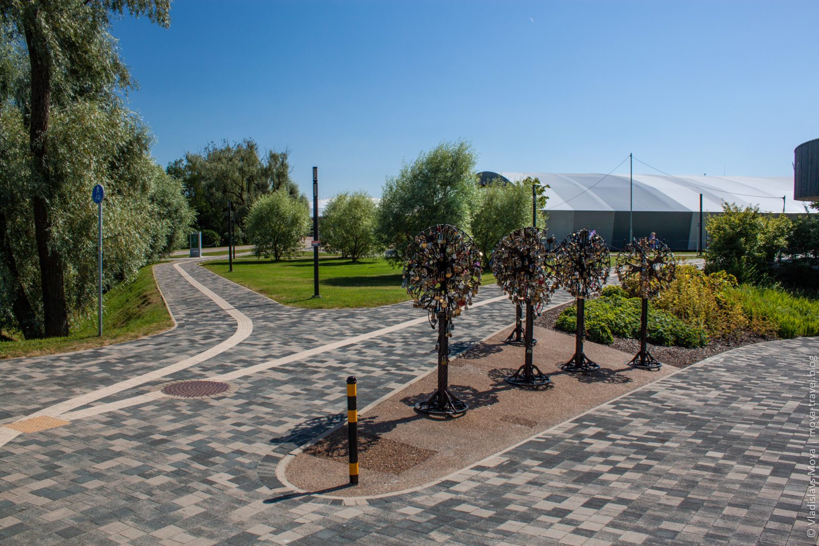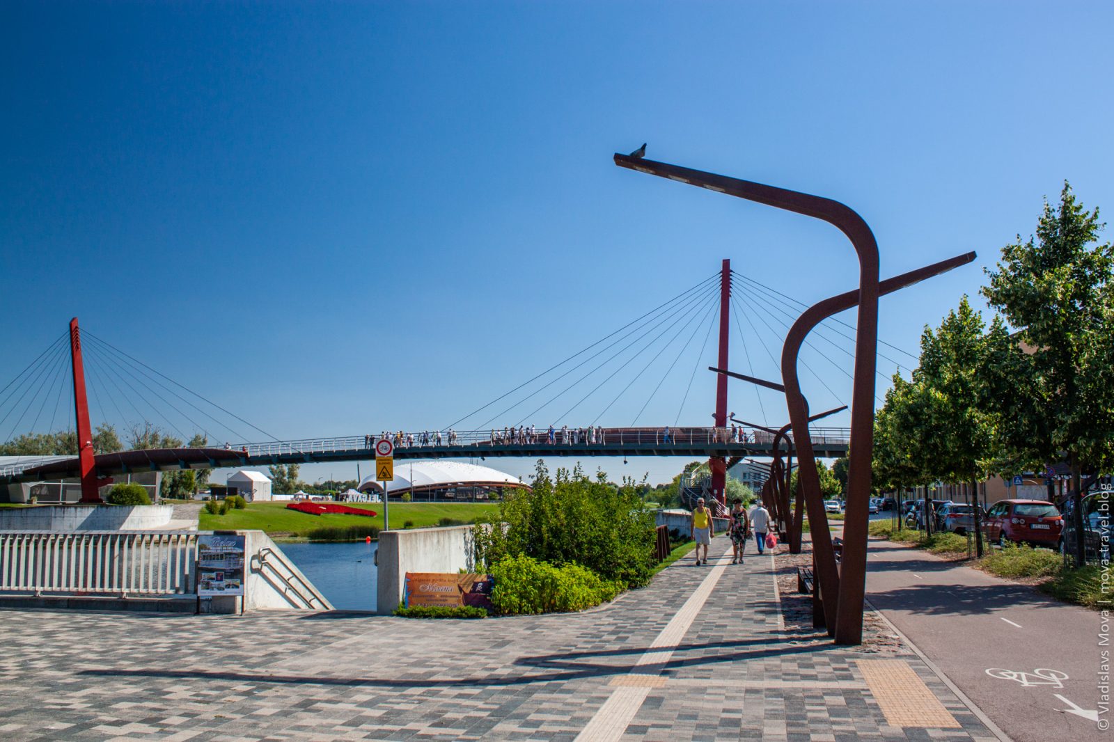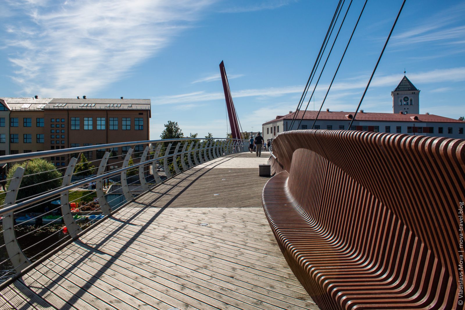 Через Дриксу (небольшая река, являющаяся, по сути, одним из рукавов Лиелупе) перекинут вантовый пешеходный пост, бортики которого плавно переходят в скамейки.
