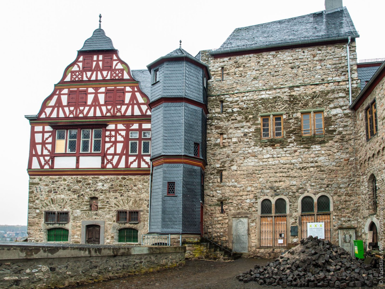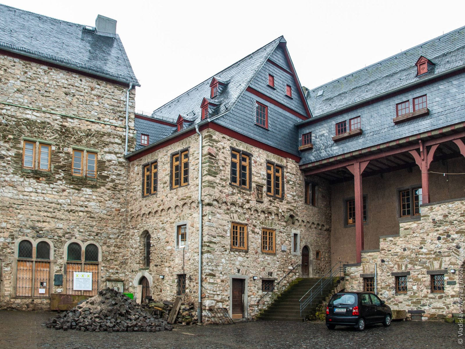 Прямо за собором находится вторая главная городская достопримечательность – Лимбургский замок. К сожалению, я затрудняюсь сказать, когда он был построен, так как различные источники дают самые разнообразные даты – начиная от 9 и вплоть до 13 века! Предполагаю, что какие-то помещения были построены как раз в 9 веке, после чего замок постепенно расширялся, а основную его часть возвели уже в 13 веке, поэтому и существует путаница с тем, какой именно период времени брать в качестве момента основания замка.