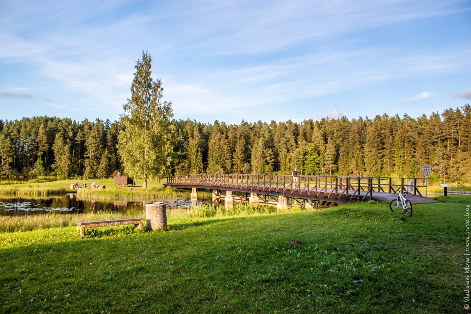 На другом конце парка находится зона активного отдыха с площадками для пляжного волейбола (они на фото не попали), а также небольшим островом, на который перекинут деревянный мост. На острове имеется кабинка для переодевания, так что, могу предположить, что в жаркие дни местные жители купаются в этой реке.